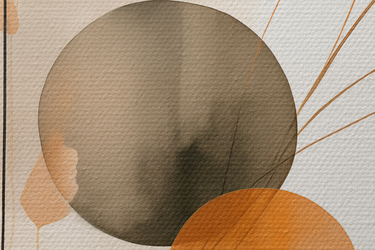 Tableaux rondes Imitation de peinture abstraite avec des cercles orange et gris, des feuilles et des branches, style moderne, effet aquarelle Nr r46697