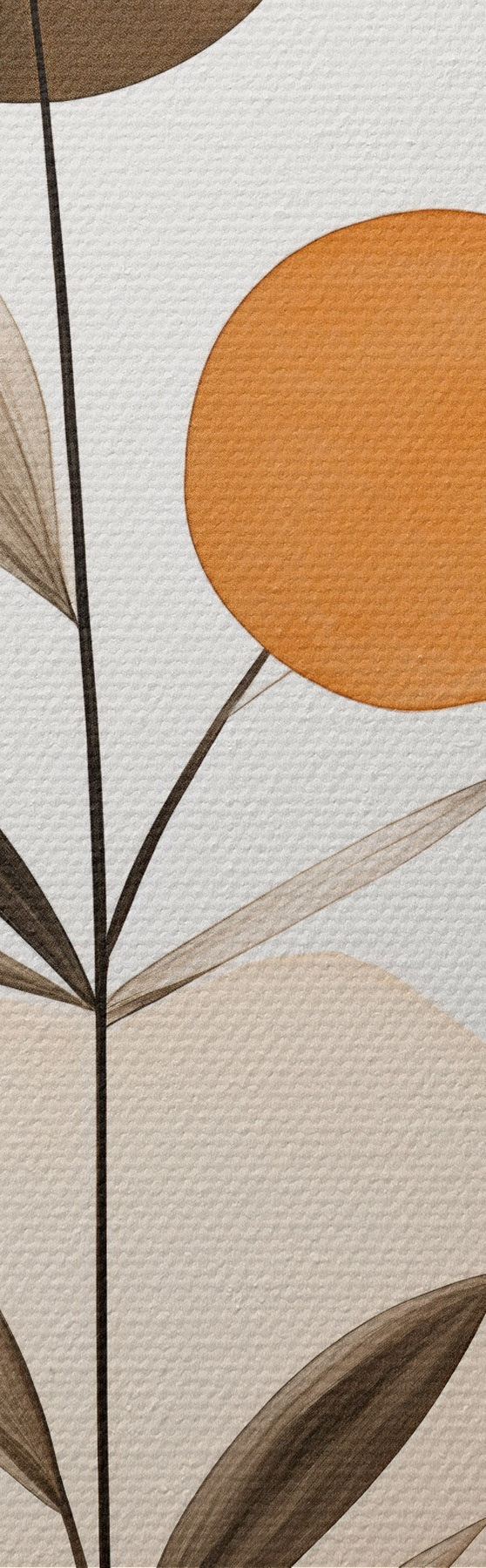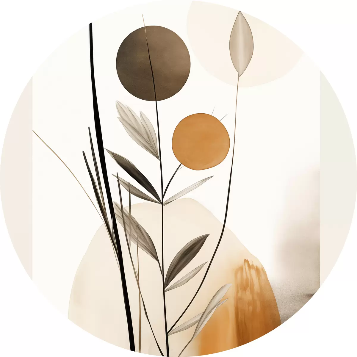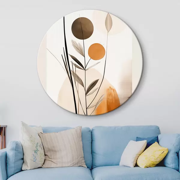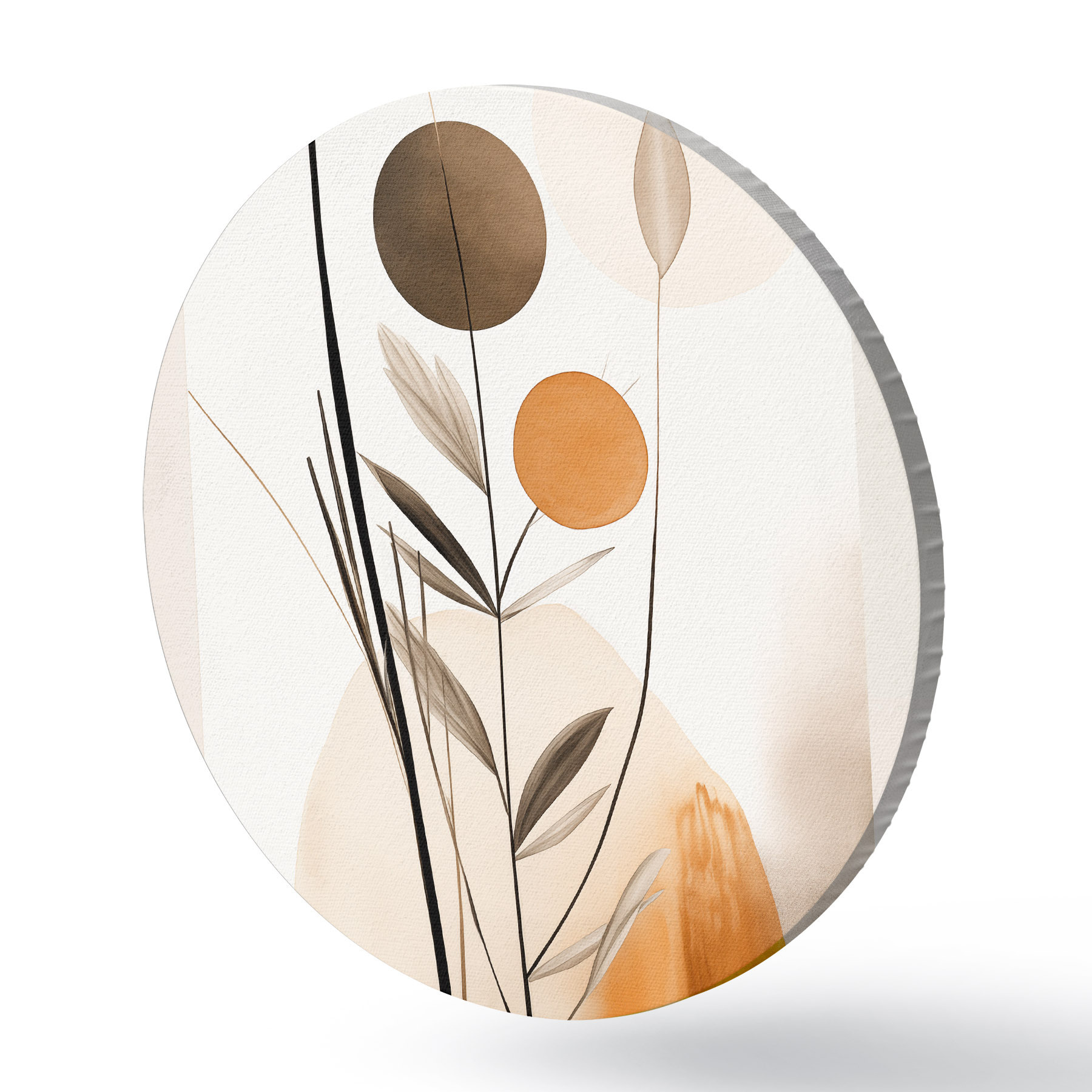Tableaux rondes Imitation de peinture abstraite avec des cercles orange et gris, des feuilles et des branches, style moderne, effet aquarelle Nr r46698