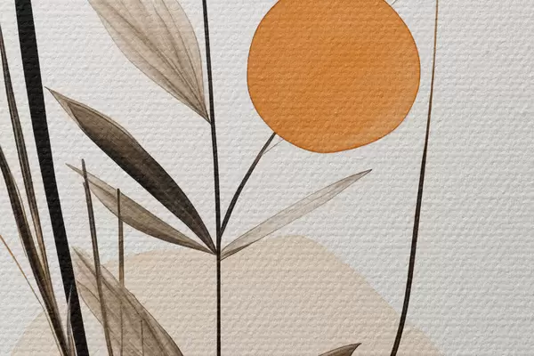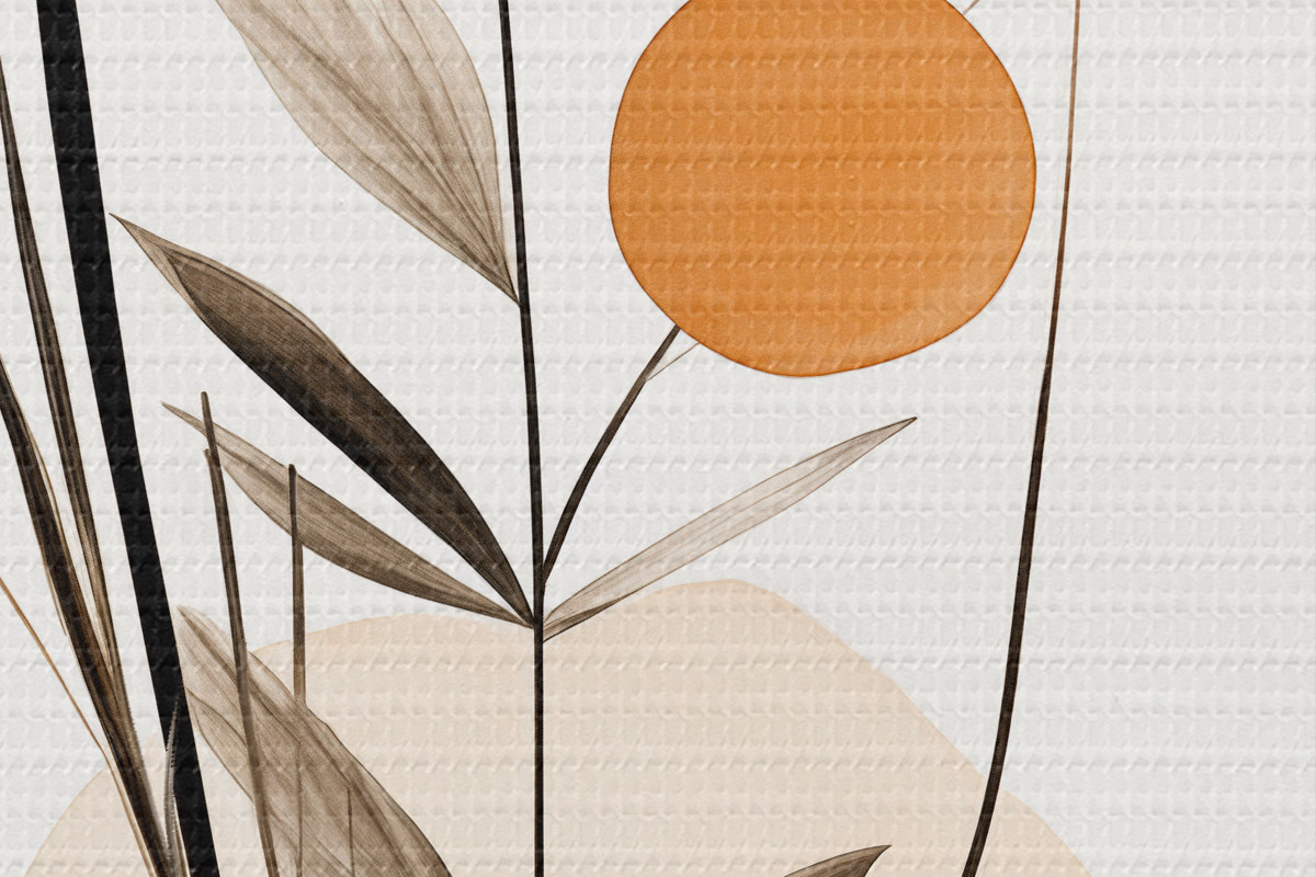 Tableaux rondes Imitation de peinture abstraite avec des cercles orange et gris, des feuilles et des branches, style moderne, effet aquarelle r46698