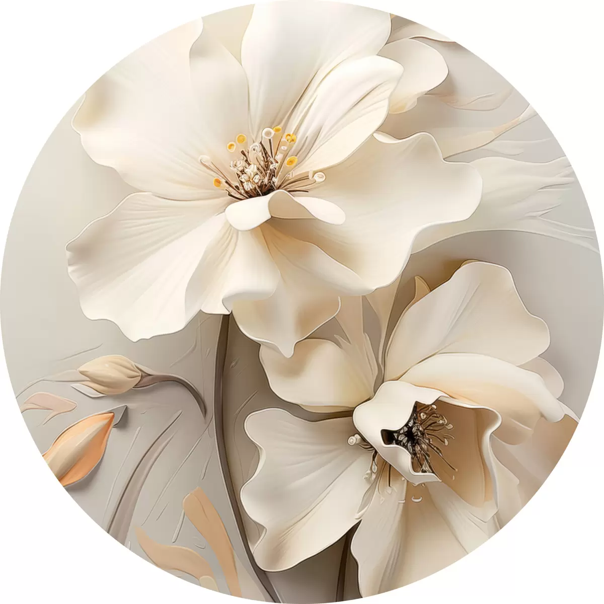 Tableaux rondes Fleurs blanches, pétales aux ombres douces, fond beige clair, composition élégante, style minimaliste r46700