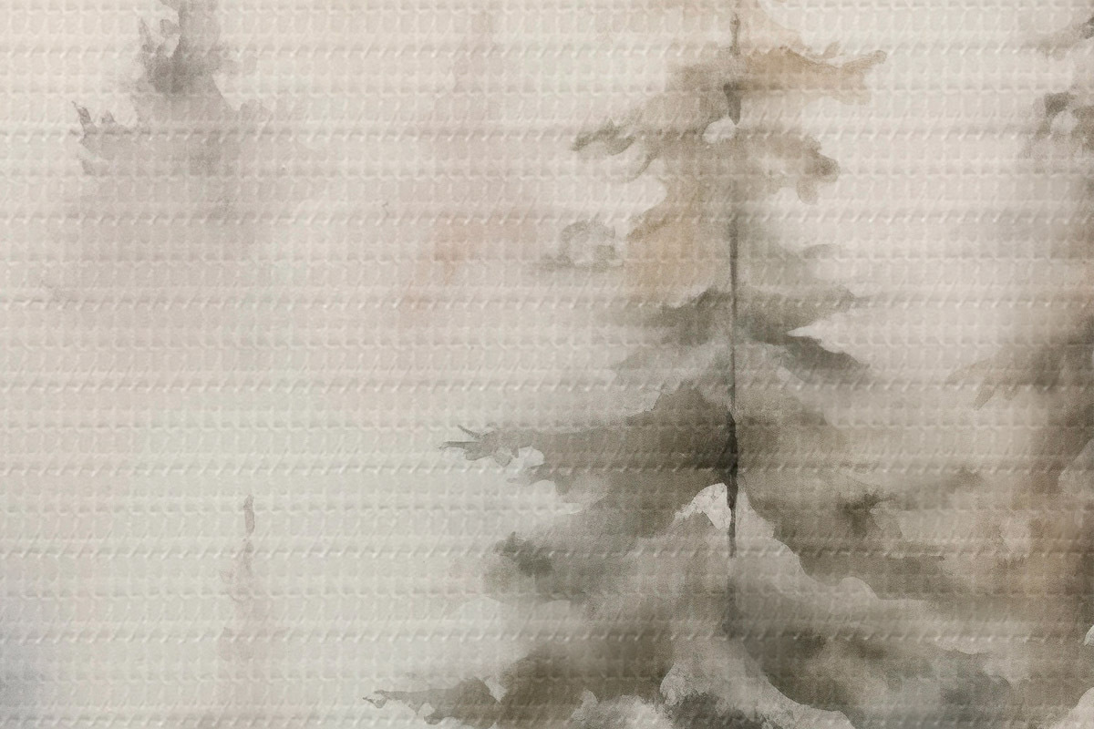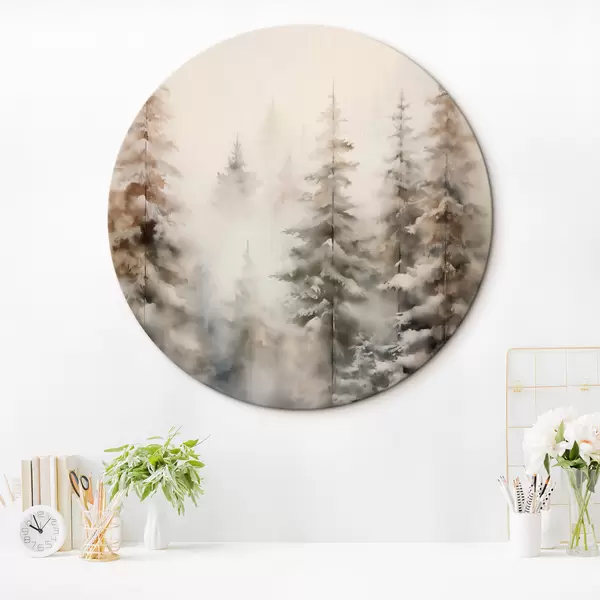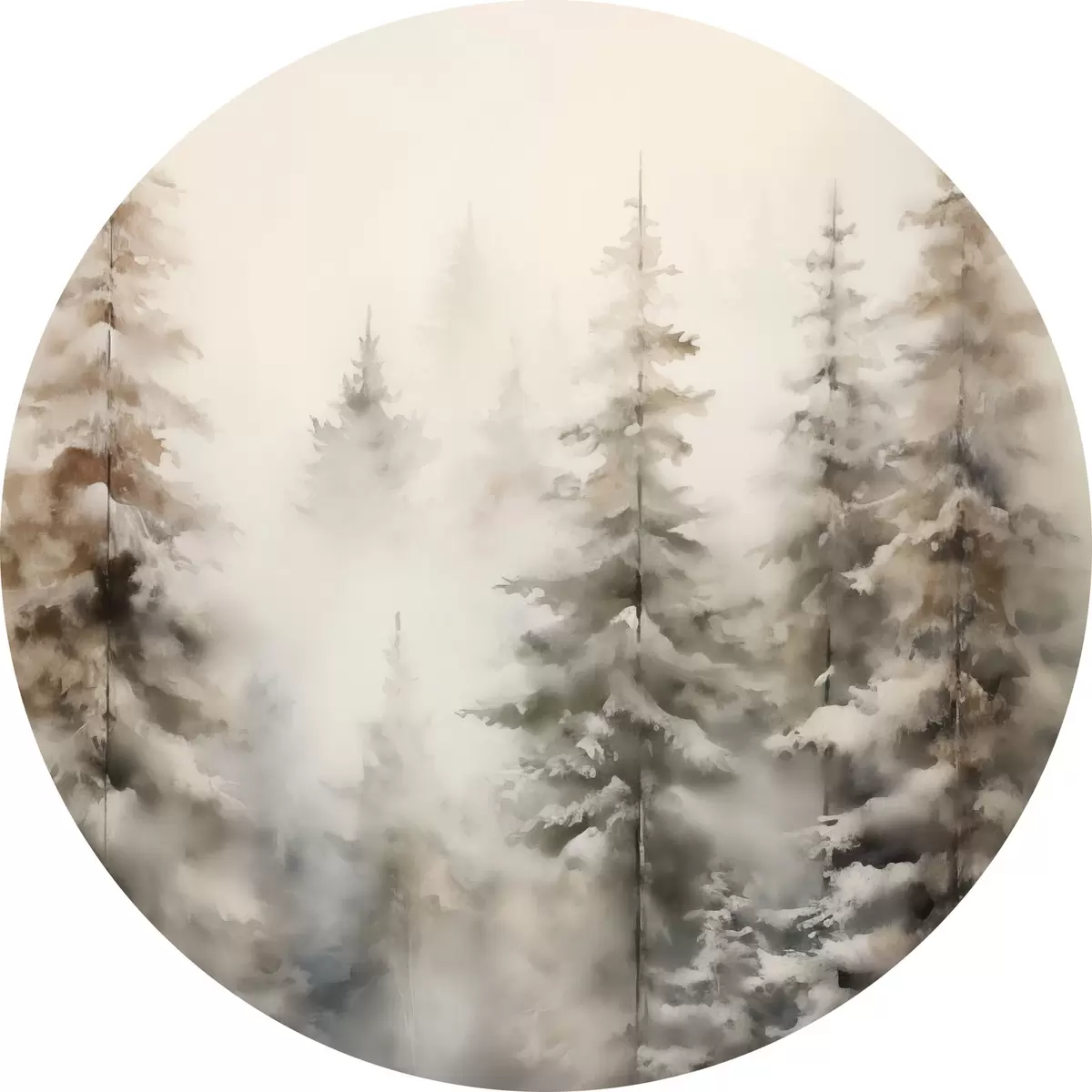 Tableaux rondes De grands pins recouverts de neige, dressés dans une forêt brumeuse, une scène hivernale douce et feutrée. Nr r46701