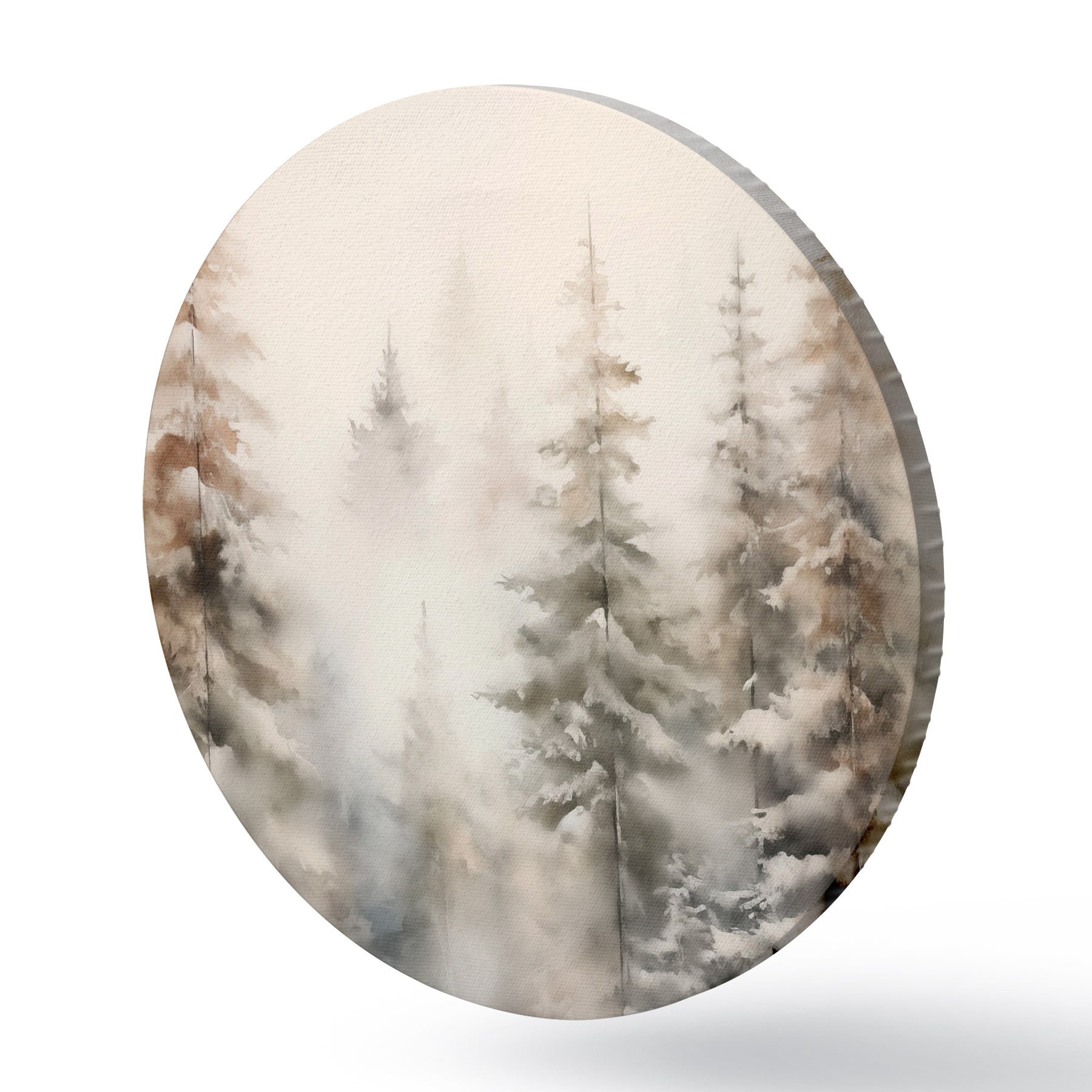 Tableaux rondes De grands pins recouverts de neige, dressés dans une forêt brumeuse, une scène hivernale douce et feutrée. r46701