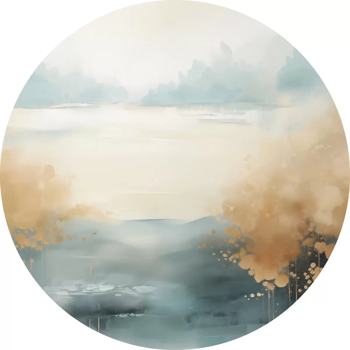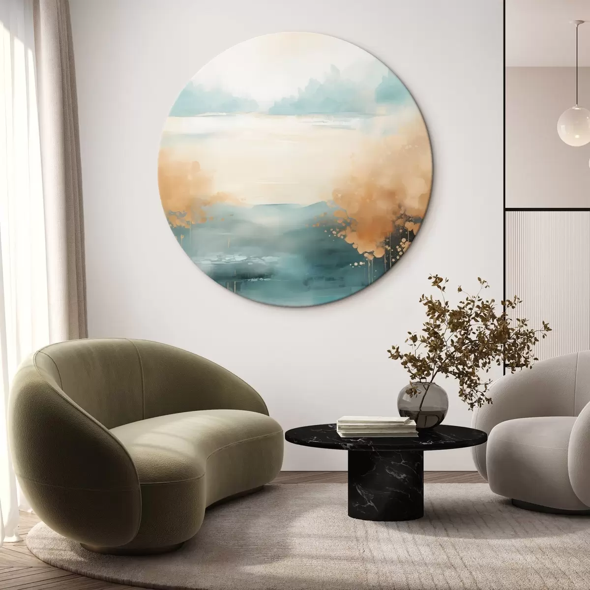 Tableaux rondes Paysage abstrait avec montagnes et lac dans des tons bleu sarcelle et jaune texturé, coups de pinceau doux, œuvre minimaliste Nr r46704
