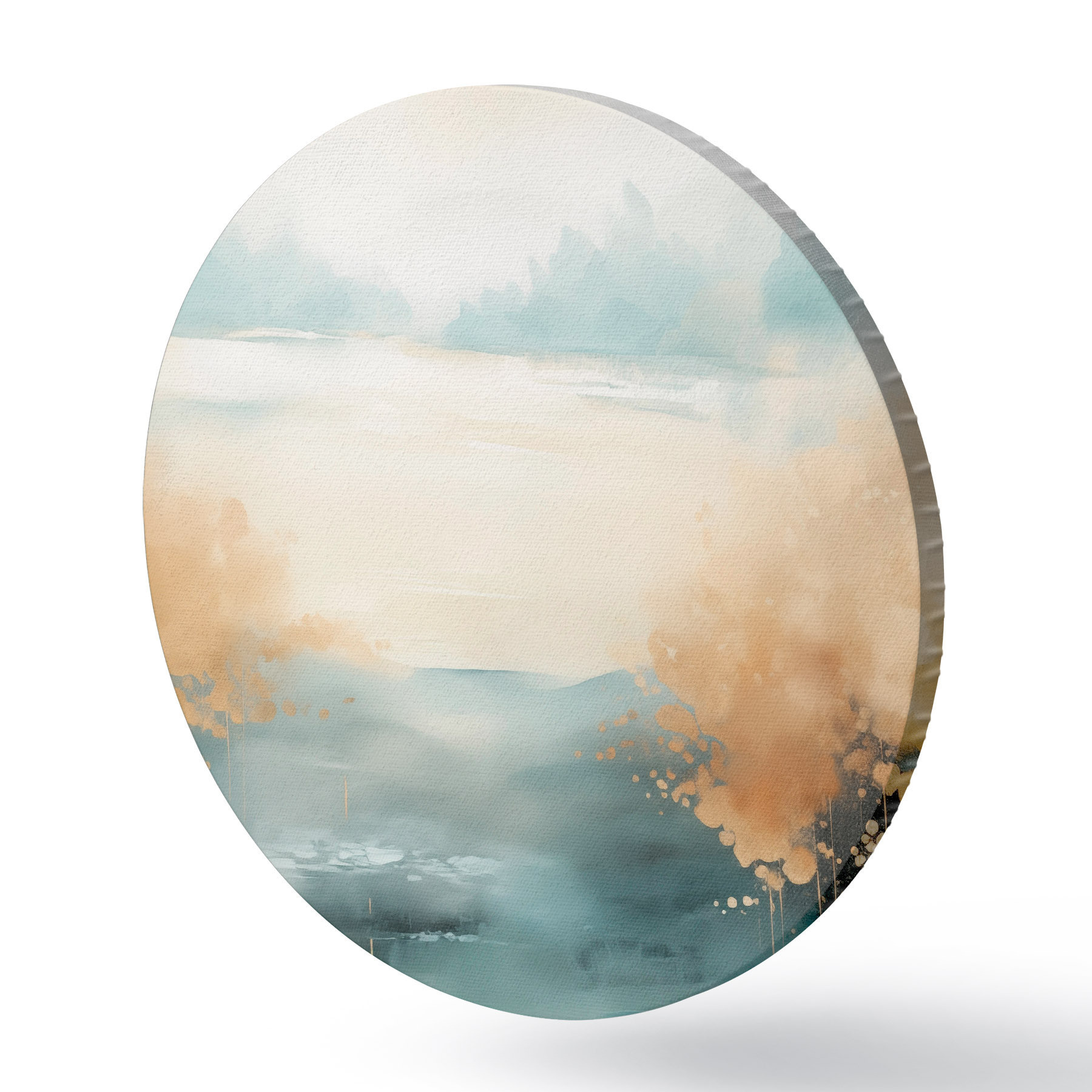 Tableaux rondes Paysage abstrait avec montagnes et lac dans des tons bleu sarcelle et jaune texturé, coups de pinceau doux, œuvre minimaliste r46704