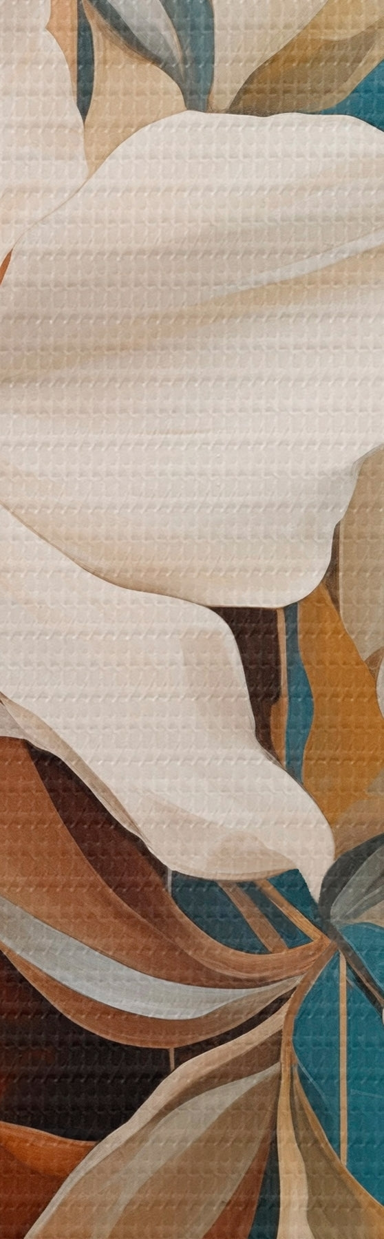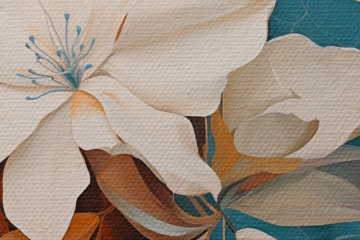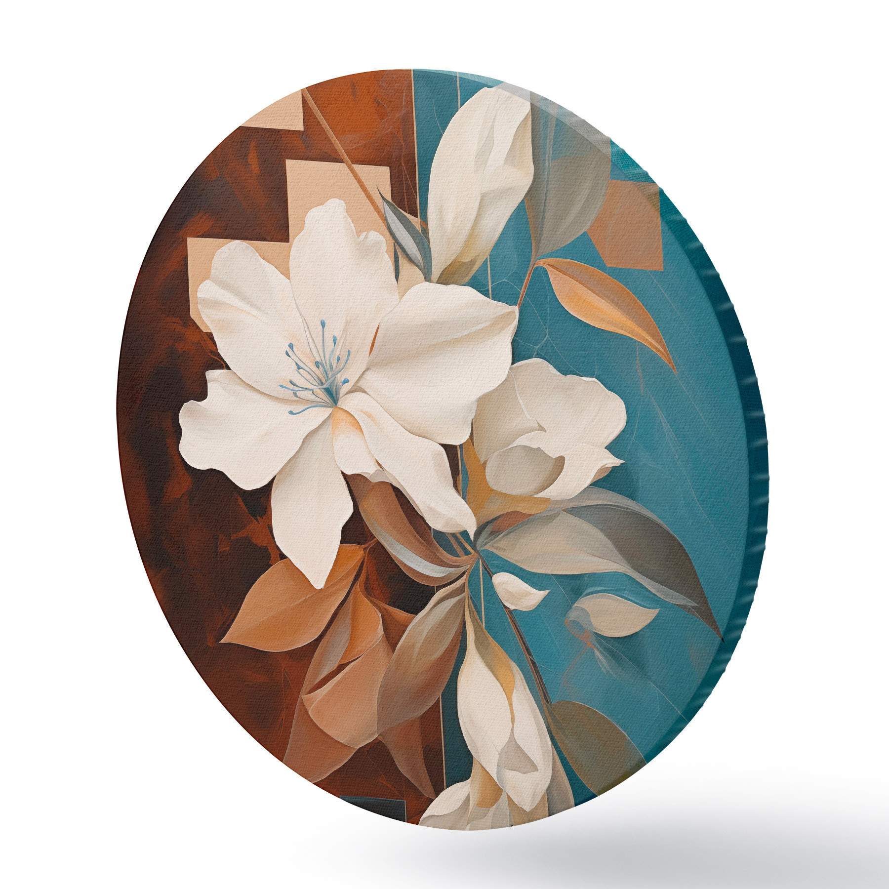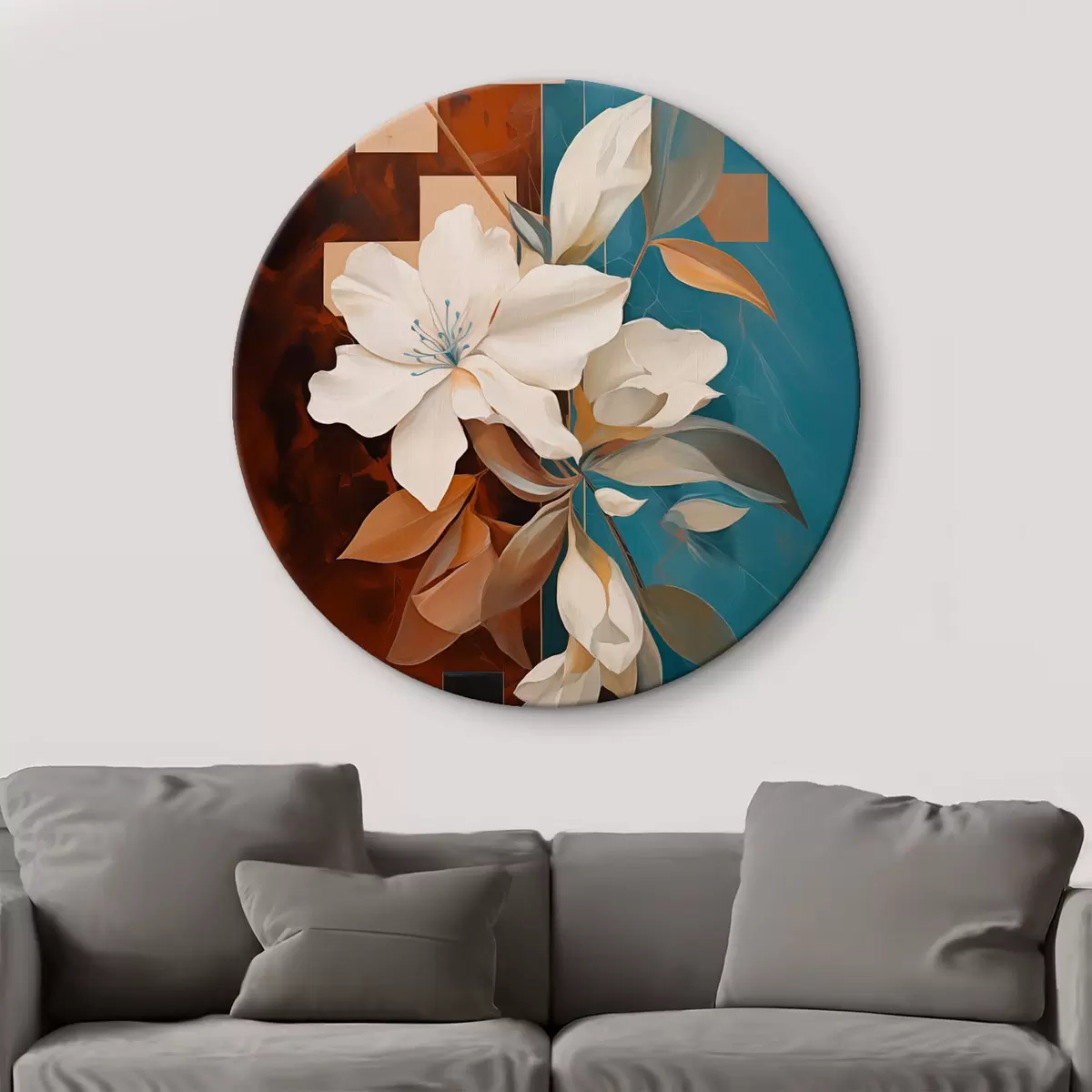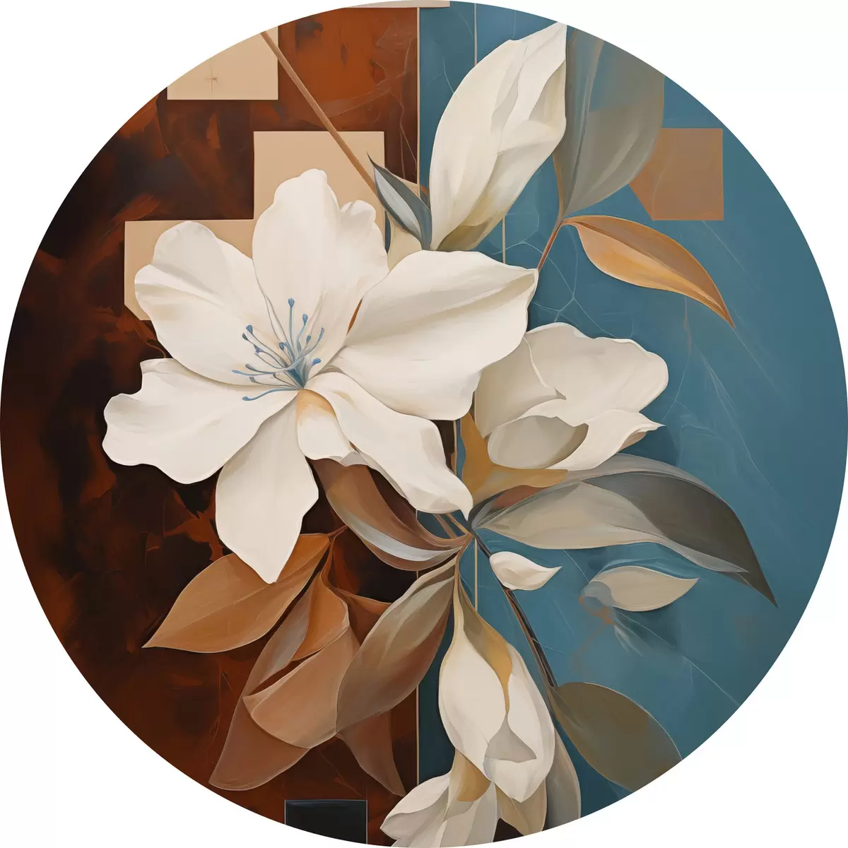 Tableaux rondes Fleurs et feuilles blanches abstraites sur fond brun et bleu avec des formes abstraites, dans un style minimaliste. r46709