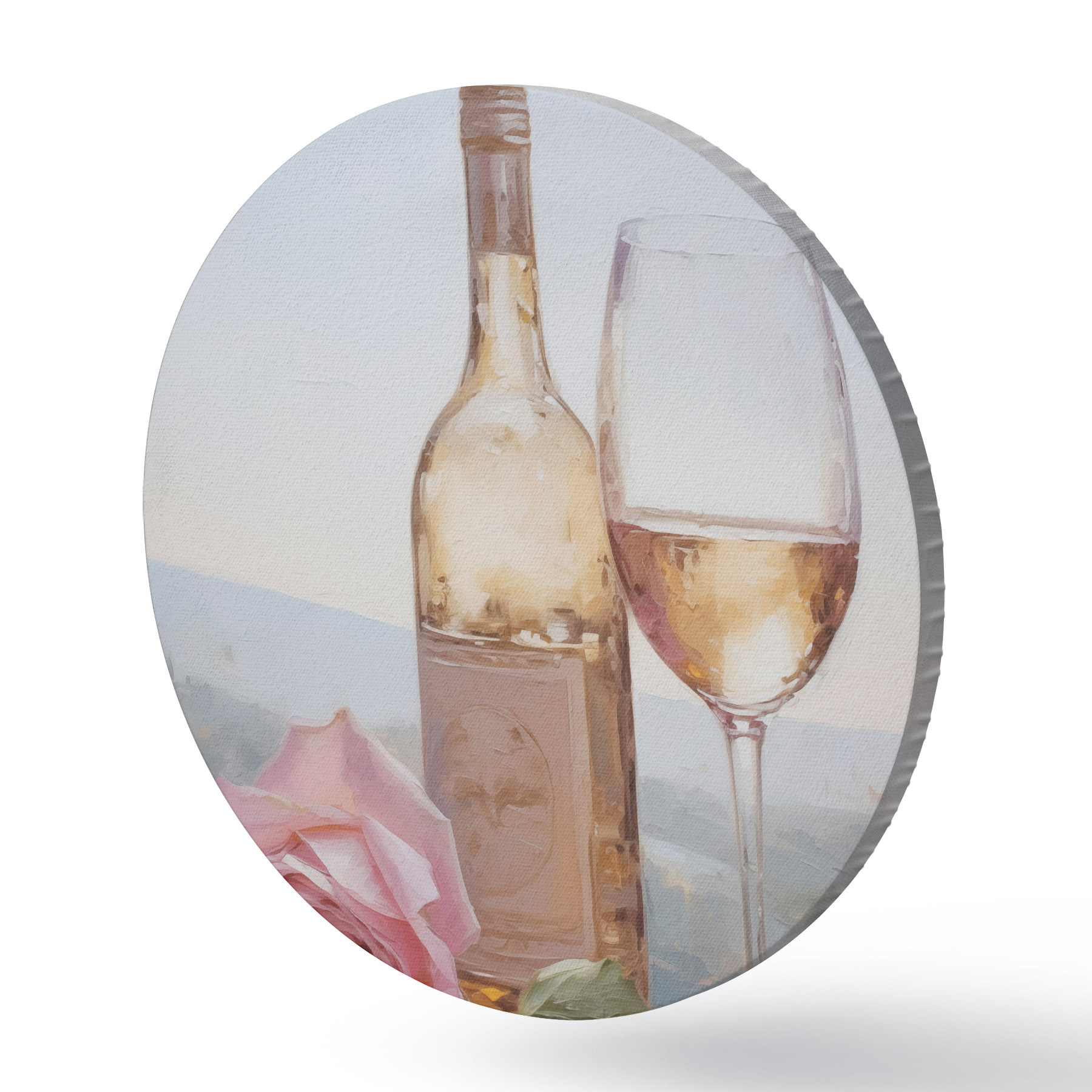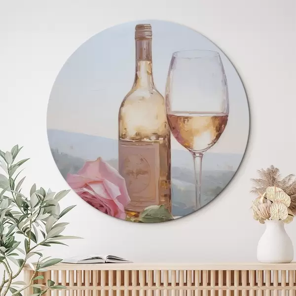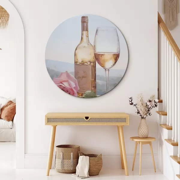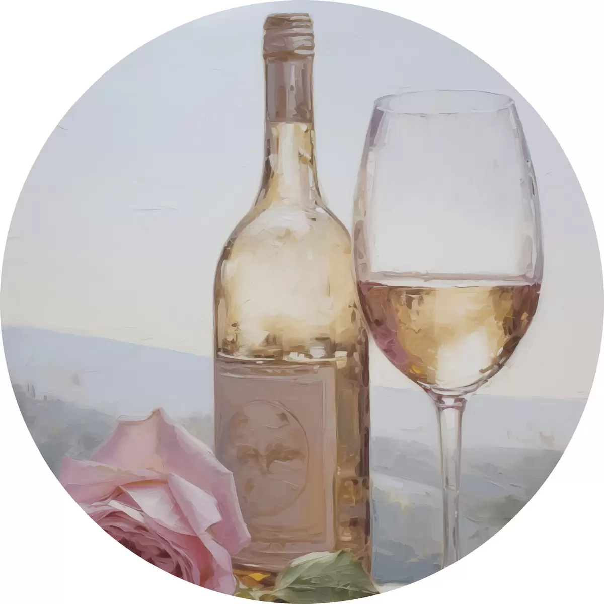 Tableaux rondes Une bouteille et un verre de vin, ainsi qu'un petit chien portant des lunettes, imitation peinture Nr r46721