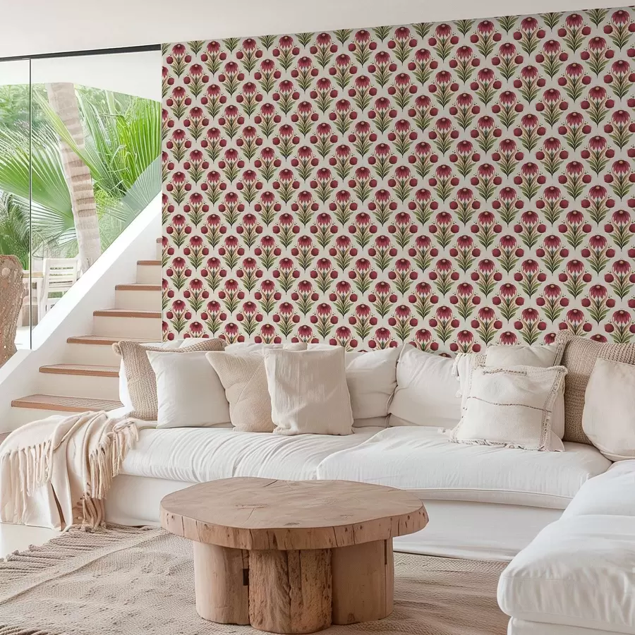 Papier peint Ornement floral symétrique dans des tons riches rouge-vert